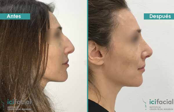 - En mujeres: La reducción del caballete o giba es algo mayor que en los hombres de tal manera que la punta sobresale un poco, 1 milimetro, respecto al dorso. Hay mujeres que incluso les gusta que sobresalga mas la punta, mas respingona, teniendo un dorso en “tobogán”.